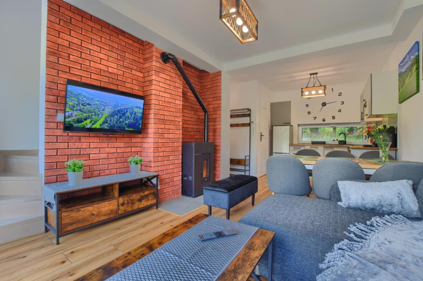 Dom z 2 sypialniami. This holiday homes special features are the hot tub and the fireplace. Guests will find a stovetop, a refrigerator, a dishwasher and kitchenware in the well-fitted kitchen. The holiday home also provides guests with a barbecue. Featuring a terrace with garden views, this holiday home also provides a washing machine and a flat-screen TV with streaming services. The unit offers 4 beds. Dom wakacyjny - 6 osobowy. Powierzchnia pokoju ok.: 60 mkw.